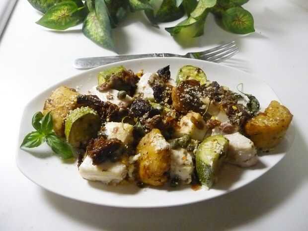 Sol tomates secos, zucchini frescos, pedazos de baguette y hierbas también se asan juntos en este medley de estilo mediterráneo saludable y sabroso.