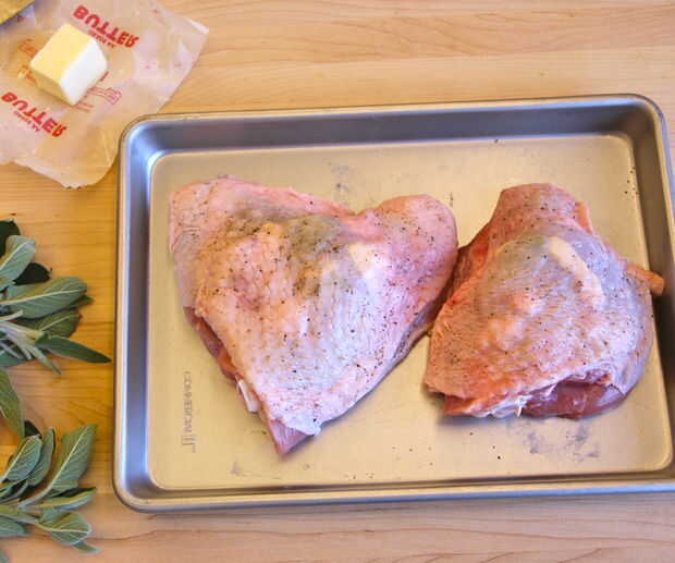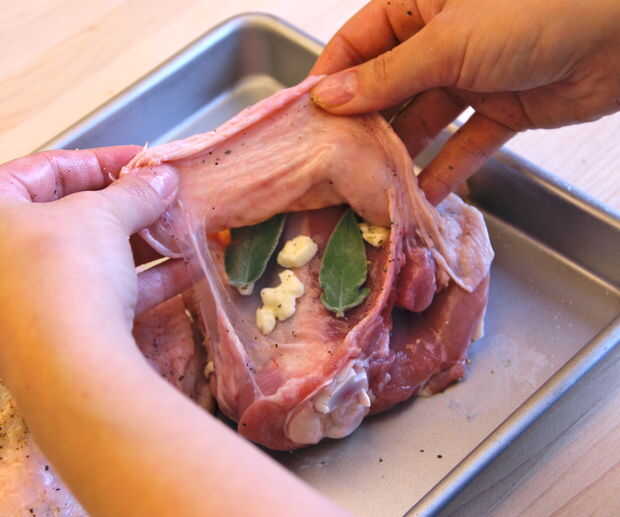 Añadir 2-3 hojas de salvia y una cucharada más o menos o mantequilla debajo de la piel y luego presione en su lugar.