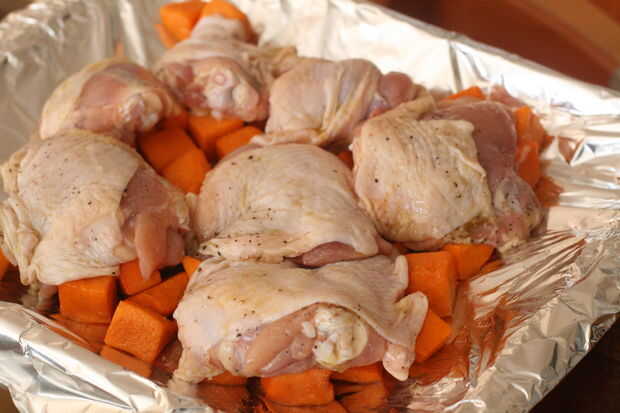 Mezclar la calabaza en trozos con aceite de oliva, miel, canela, sal y pimienta. Coloque en una asadera. Añadir el pollo, cubriendo la superficie de la calabaza, la piel hacia arriba.