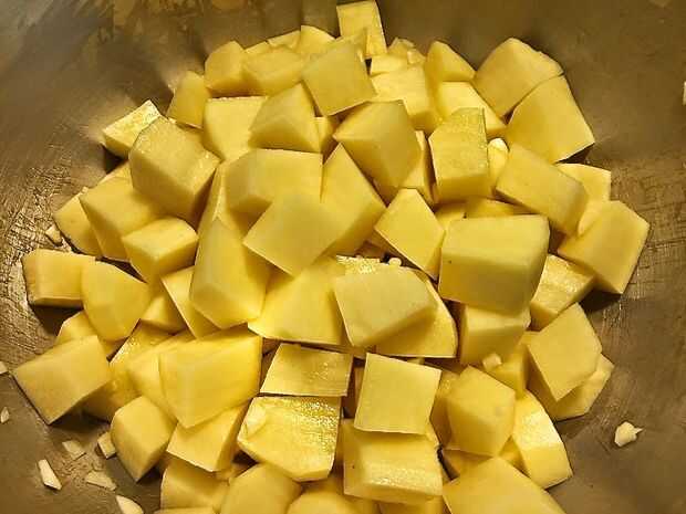 patatas al ajo molido ahora son tradicionales, por lo menos en nuestra casa y con razón.Paso 1: Patatas de chuleta Picar patatas * y añadir a la olla fría y vacía. Los trozos más pequeños el más rápidos te cocinan. Aquí he utilizado ~ 2 libras de oro
