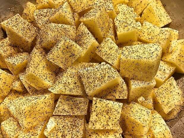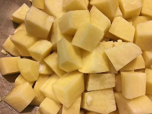patatas al ajo molido ahora son tradicionales, por lo menos en nuestra casa y con razón.Paso 1: Patatas de chuleta Picar patatas * y añadir a la olla fría y vacía. Los trozos más pequeños el más rápidos te cocinan. Aquí he utilizado ~ 2 libras de oro