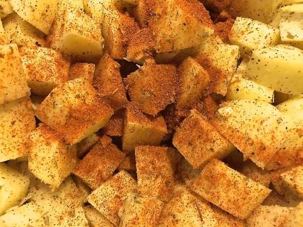 En el bol de patatas y ajo; Añadir sal, pimienta, Romero, cebolla en polvo, condimento de punto Fox y pimentón.