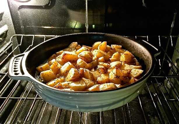 Coloque las patatas en el horno precalentado. Hornear 45-50, o hasta que estén doradas.