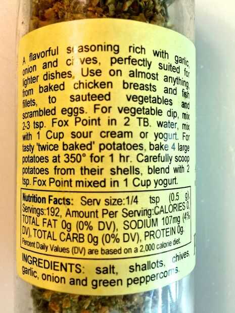 Condimento de punto Fox es tan bueno en todos los alimentos de pescado a las verduras. Estallando con el rico sabor de la chalota y cebolleta. Utilice 1 cucharada por libra para sazonar pollo cocido y huevos revueltos. Sabroso chapuzón utilice 2 cucharaditas de punto Fox en 1 taza de crema agria o yogur. El dip hace también una cobertura excepcional para patatas al horno, o hacer una rápida pollo o ensalada de atún al mezclar 3 tazas de pollo cocido o trozos de atún con 1 taza de dip de punto Fox. Porque no utilizamos cualquier mezcla de agentes en esta (o cualquier otra) antiaglomerantes, tiende a grupo algo. Para que siga libre, guarde en el refrigerador.