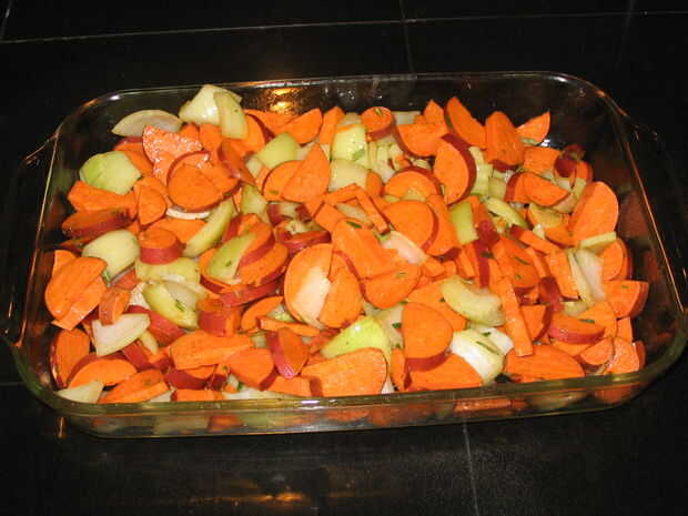 Alimentos, Recetas, Ajo, Asado, Horno, Vegano, Vegetariano, Acción de gracias, Cebolla, Asar, Patatas, Patata dulce, Tubérculo, Batatas