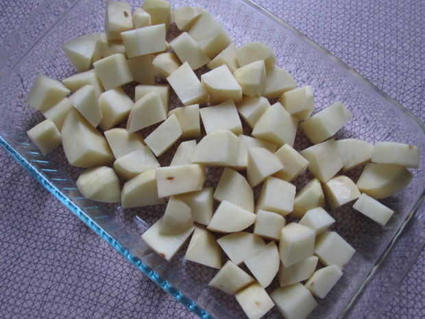 Colóquelos en el recipiente para ver si tienes la cantidad correcta - si usted necesita un poco más, trocear la patata cuarto.