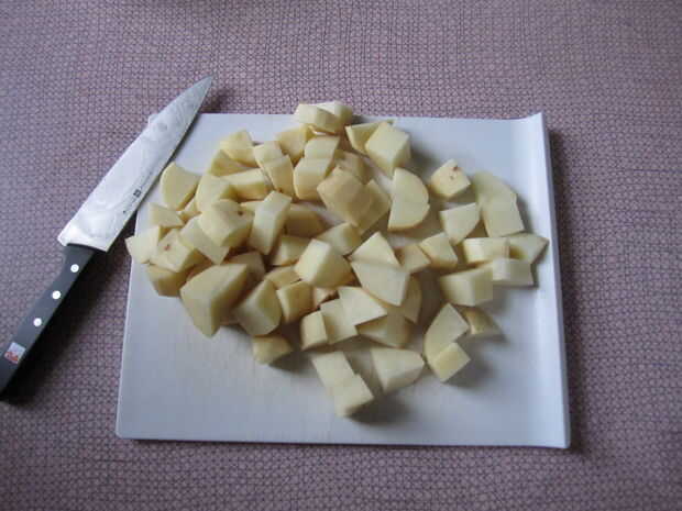 Pelar las patatas y cortarlas en trozos grandes, 1 1/2 pulgadas al menos.