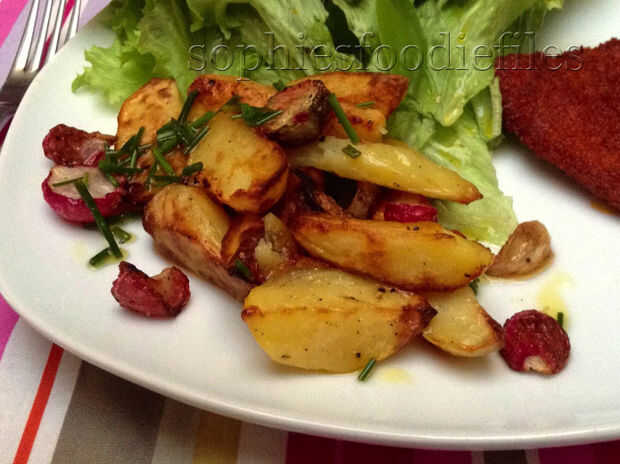 Ayer inventé Este precioso plato. Yo tenía un manojo de rábanos de lateral mixto de mi jardín y quería usar de una manera diferente. Había limpiado y cada que corta en 2 mitades y había asado en el horno junto con blanco papas peladas gajo. Me sirvio un aderezo de vinagre balsámico blanco cebollino fresco hecho en casa para Salsear los rábanos asados y cuñas! ¡ Fue increíble! Los rábanos asados son un poco más dulce y aparte y el apósito sobre ellos, toma estos rábanos asados y papas a un otro nivel!!!!!!