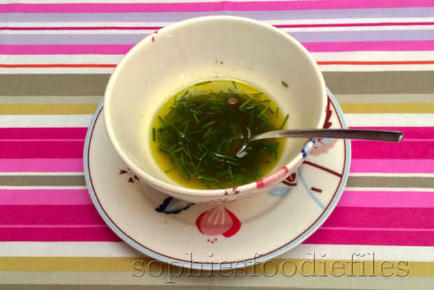 Sirve esta deliciosa cena con hojas de la ensalada de nuestra huerta y con flores de cebollino comestible también. Había cubierto el aderezo también sobre mi ensalada. Sirve con shnitzels de cerdo. MMM,...:)