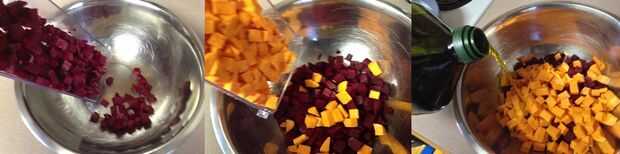 Lavar, pelar y trocear las 3 acelgas y 1 o 2 batatas. Si las patatas son pequeñas usar dos. Si la papa es medio a grande que es suficiente. Coloque las verduras de raíz picada en un tazón grande y agregar 1/4 de taza de extracto de aceite de oliva.