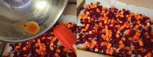 Asado de remolacha, patata dulce, lechugas mixtas y ensalada de camarones (4 / 8 paso)