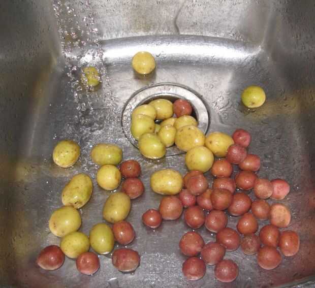 Lavado y añadir las patatas nuevas de mordida tamaño alrededor de la carne.