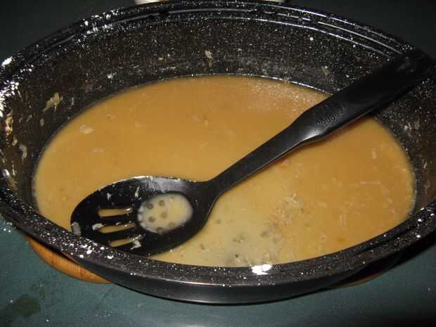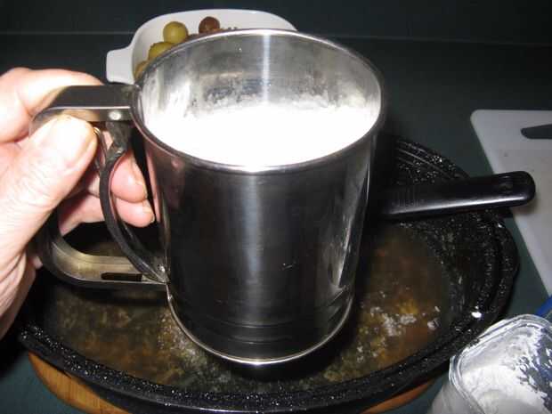 Debe haber una fina capa de jugo en la parte inferior de la cacerola. Ahora aquí está el truco para no lumpy gravy, utilizar un tamiz para agregar dos cucharadas de maicena y dos cucharadas de flor a los jugos.