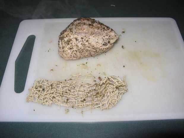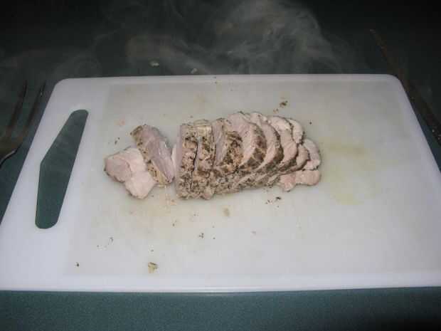 Tomar la carne hacia fuera quitar las cuerdas y cortar la carne asada.