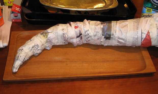Una vez que estaba feliz con el modelo de lo utilizado para formar un molde de papel aluminio, simplemente presionando una hoja grande de papel de aluminio sobre ella. Lámina de gran calibre hubiera sido ideal pero no tengo ninguna, por lo que acababa de usar múltiples capas (2-3 a mi me funciono). Doblado los bordes sobre añadir cierta rigidez y mirado adicional utilizado piezas de apoyo. Si el modelo es más largo que el molde será simple doblez hasta el final (ver tercera imagen). El molde no tiene que ser tan fuerte, fácilmente podría aplastar a mía con mis dedos pero era rígido bajo su propio peso.