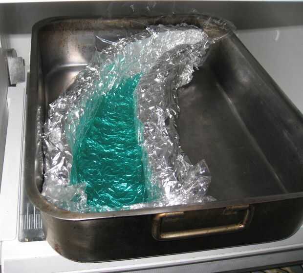 Hacer la mitad de su jugo en la primera tanda de jello, llenar el molde hasta la mitad y refrigere. Esperemos que comenzaste con más jugo y ya tienes algunos gelatina sobrantes: ponerlo en la nevera, vamos a utilizar más adelante. Tire el envoltorio plástico para deshacerse de cualquier arrugas grandes y meter en él hasta que la gelatina parece encajar muy bien en el molde.