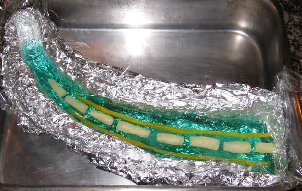Desde el principio decidí que el tentáculo tendría hueso corriendo por el centro para que las rebanadas se vería como un filete de dibujos animados. Haciendo estos múltiples se unieron como una columna vertebral que pensé sería interesante. Para hacer los huesos he intentado cortar piezas cilíndricas de pera enlatada, pero esto era muy difícil y que debo han ido con una forma amigable de pera más. Después de todo es su alien, puede mirar sin embargo como usted.