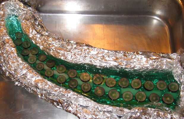 Para ventosas en la parte inferior de los tentáculos usé uvas rojas cortadas en redondos, que creo que dado vuelta hacia fuera muy bien. Debo haber hice la gelatina un poco más ligera aunque para que sean más visibles.