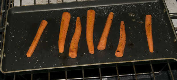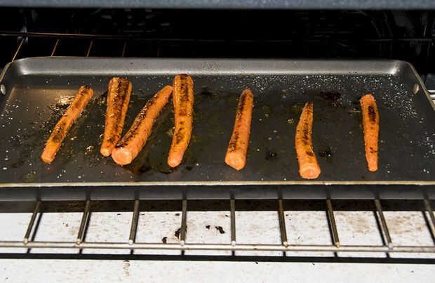 Después de que el temporizador de 20 minutos se apaga, abra el horno, unte el glaseado sobre las zanahorias y luego les flip para que los fondos están ahora arriba. Esmalte de ese lado, cerrar el horno, ajuste el temporizador durante 10 minutos.
