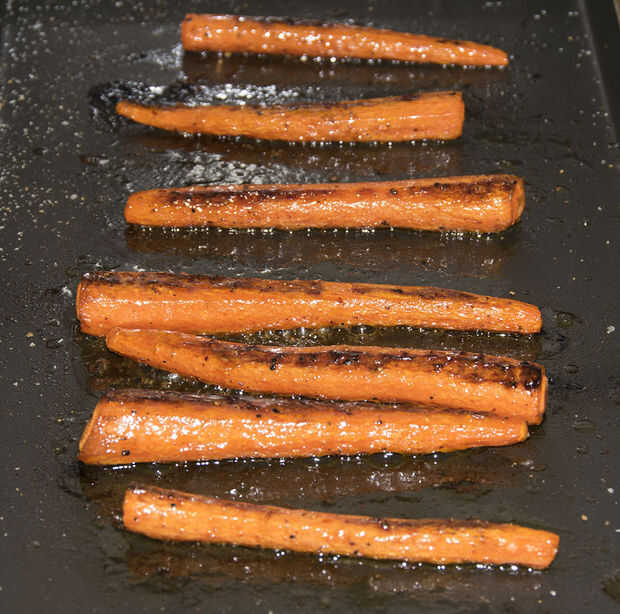Después de un total de 40 minutos de cocción, las zanahorias se pueden hacer. Si fueran excepcionalmente gruesas, hacer otra vez la rutina flip-esmalte-esmalte y dejarlos continuar la cocción hasta que esté listo (cuando un tenedor pasa fácilmente a través de la parte más gruesa de una zanahoria, pero no son papilla).