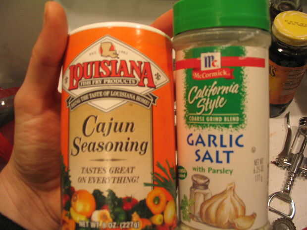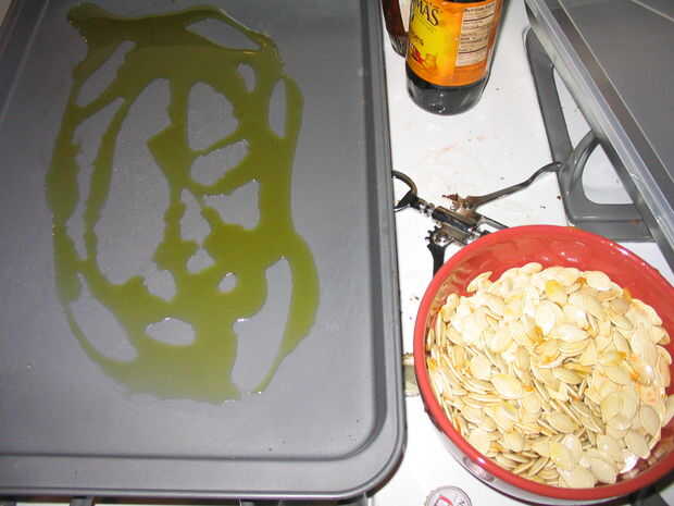 Rocíe la bandeja para hornear con aceite de oliva, volcado en sus semillas enjuagadas y escurridas y agregue los condimentos. Utiliza una combinación de sal de ajo y especias cajun aquí, pero use lo que quiera. Las opciones incluyen salsas picantes, salsa de soja, polvo de curry, salsa worchestershire o cualquier otra cosa que hace su boca feliz.