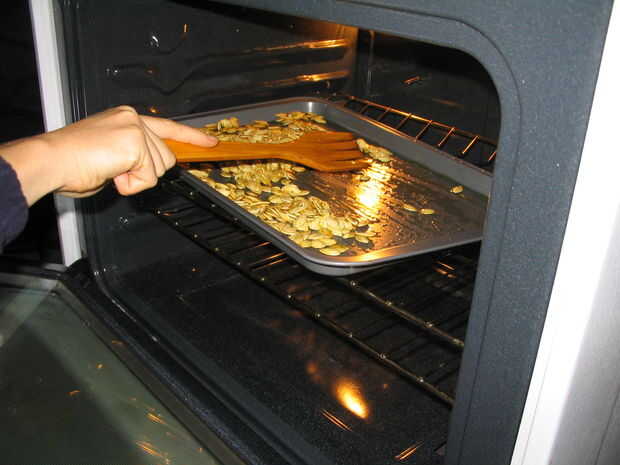 Dependiendo de cómo has cargado hasta la bandeja y el entusiasmo de su horno, pueden tomar 15-30 minutos para tostar las semillas de las calabaza. La pequeña cantidad que he usado aquí hecha una buena capa delgada y tostada en unos 15 minutos. Mantener control y revuelva con frecuencia.