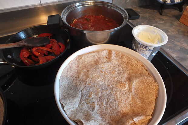 Cubra con otra tortilla tostada y continuar hasta que todo el relleno y tortillas se acaban.