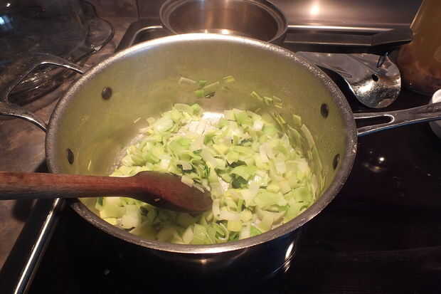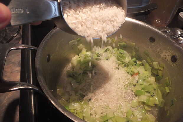 En un medio precalentado tamaño olla saltear los puerros en el aceite durante 5 minutos hasta que transparente un poco. Revolver para cocinar y distribuir el calor uniformemente. Añada el arroz y seguir revolviendo para cubrir cada grano. El arroz debe comenzar a ver transparente en el exterior después de 2-3 minutos.