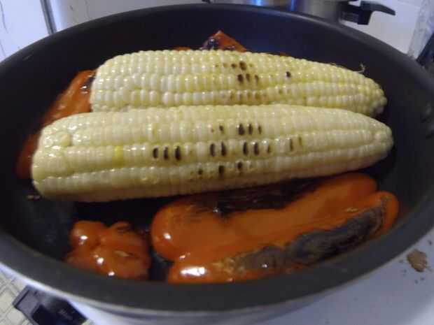 Ase los pimientos rojos y maíz (entero) en una cacerola en la estufa a fuego alto.