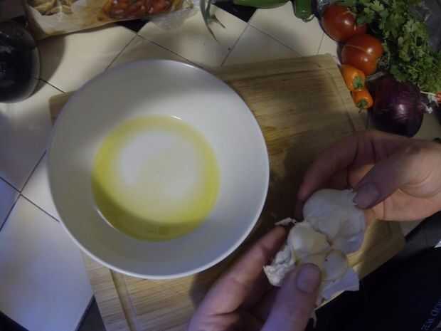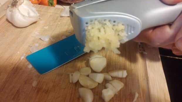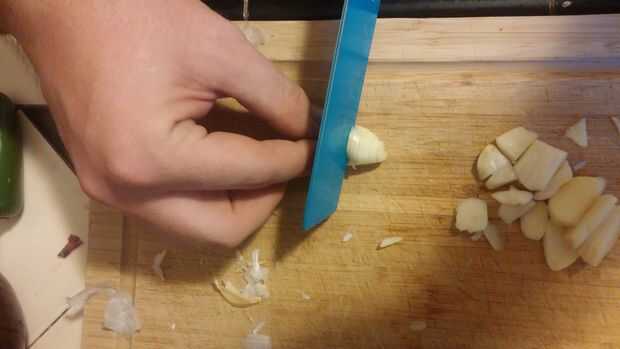 Eliminar capas de la piel, romper los dientes y luego aplastar o cortar en una picada.
