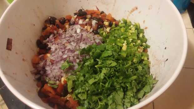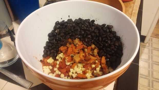 A continuación, agregue la salsa de pimiento rojo asado, maíz y frijoles negros. Revuelva suavemente para mezclar.