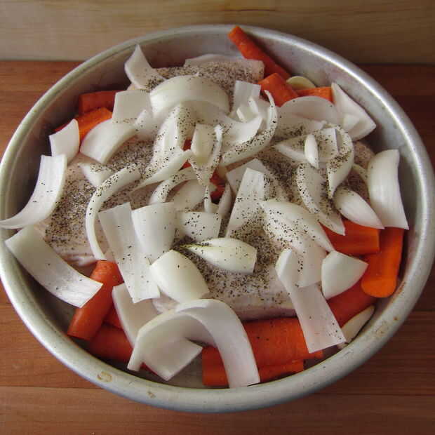 Añadir que todos los ingredientes a un tamaño adecuado de la asación de la cacerola asegurándose de grasa de pollo es para arriba. Sal y pimienta abundante.