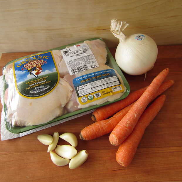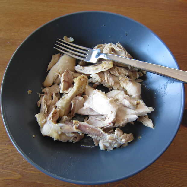 Retirar la bandeja del horno y deje enfriar de pollo hasta que te puede tirar toda la carne al hueso. Reserva para una comida posterior.