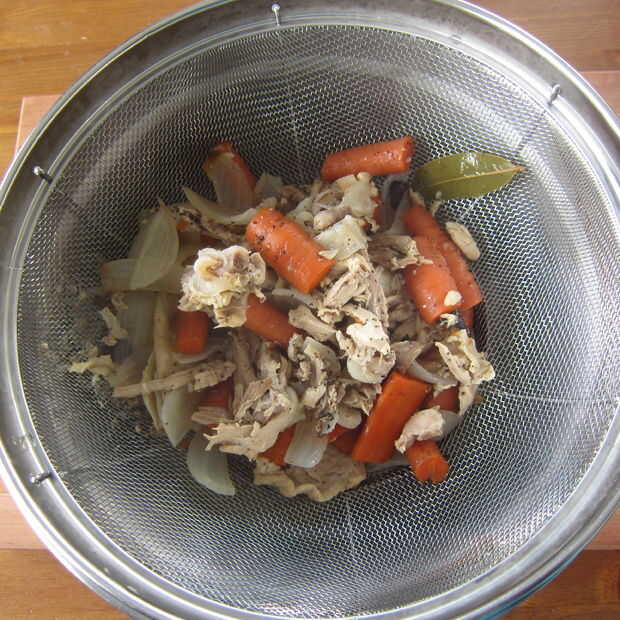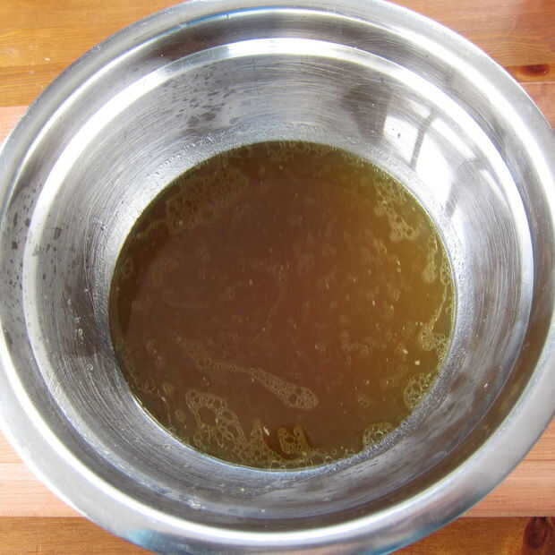 Usando un colador de malla fina grande colar el líquido en un recipiente grande y reservar.