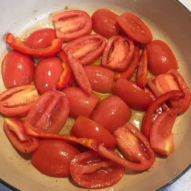 Cortar su roma tomates longitudinalemente en tercios y quitar las semillas con una cuchara. Mezclar el pimiento rojo y romas en suficiente aceite de oliva para cubrir (alrededor de 1/4 taza o menos) y sazonar con sal y pimienta. Coloque la capa solo tomates y pimientos en una asadera. Asar durante 45 minutos.