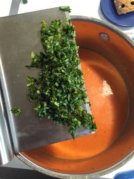 Después de haber mezclado sus romas asada, pimiento rojo, cebollas y ajo, ponerlos en una olla de la salsa y añadir una caja de 32 oz de caldo de pollo (menos si te gusta la sopa gruesa) con 1 cucharadita de condimento de Pizza de Penzey y la albahaca picada. Cocinar sobre fuego medio hasta que esté burbujeando. Sal al gusto.