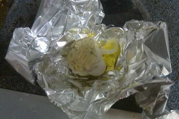 Envuelva el bulbo de ajo en otra pieza de papel de aluminio y rociar con 1 cucharada de aceite de oliva, sellar herméticamente y en hoja.