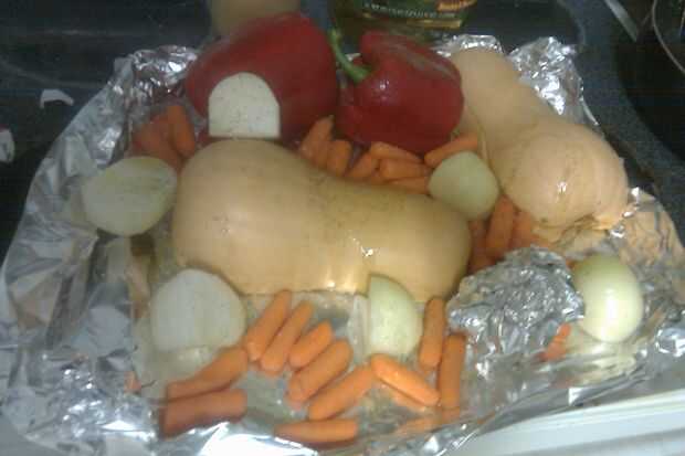 Coloque el lado cortado de la calabaza hacia abajo y arreglar las otras verduras quieras, sin les hacinamiento.