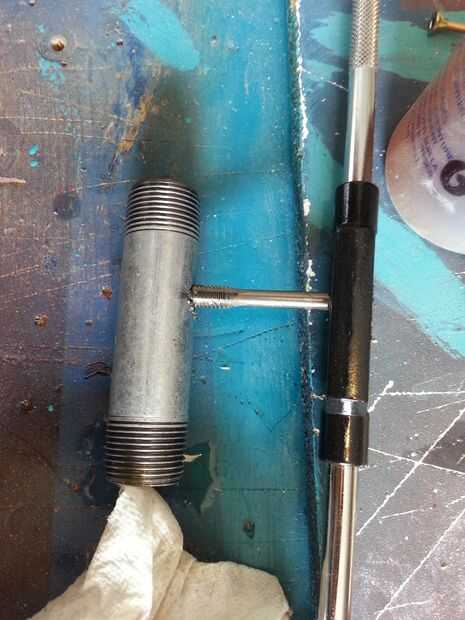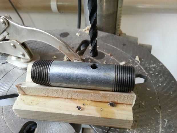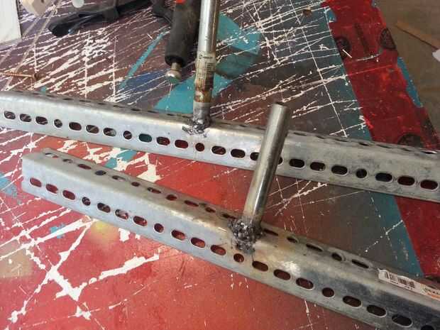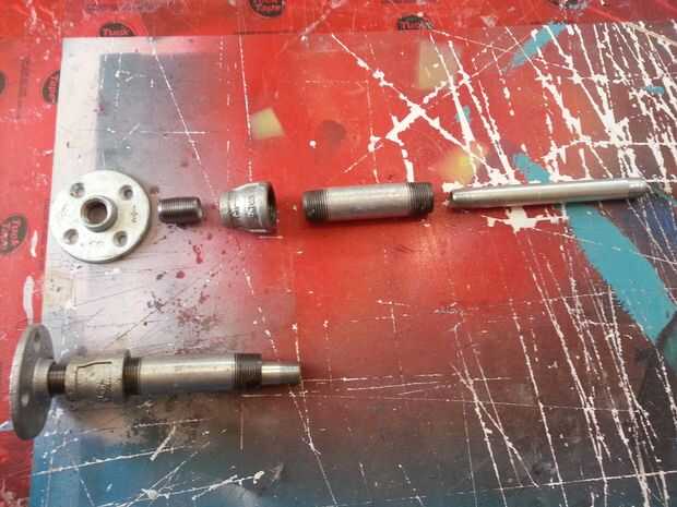 Cada lado del soporte tiene un pivote. Taladro y toque un orificio en la tubería de 3/4 de pulgada para un perno de 5/16, que fijará el soporte en su lugar. Tornillo de la brida en cada extremo del bastidor. Añadir el pezón, el reductor y la pipa de acero galvanizada de 3/4 de pulgada. Terminé mi 3/4 y 3 de corte 8 pulgadas más corto de la pipa con una amoladora y limar los extremos cortados para eliminar las rebabas. Sólo necesita suficiente espacio para insertar un perno con una perilla y ser capaces de convertirlo. Coloque el tubo de 3/8 de pulgada en el ángulo de acero. Mina había soldada (excepcionalmente mal!), pero tal vez podría usar JB Weld si no tienes un soldador. Si usted decide soldar, tenga en cuenta que acero galvanizado produce algunos gases muy desagradables cuando se calienta. Lo hice sólo estas dos pequeñas soldaduras en un garaje bien ventilado. El combo del ángulo/de la pipa se sentará justo en el tubo de 3/4.