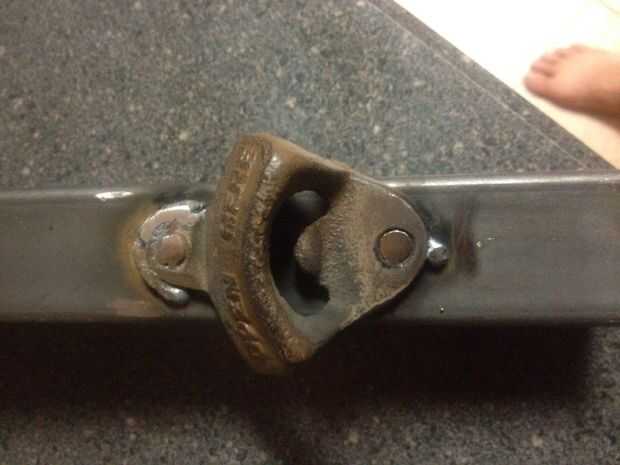 El piñón grande es un 60T comprada este producto de herramientas norte y el pequeño 9T fue de Pervis industrias. Ambos cuestan $15. en la rueda dentada grande nos soldados sobre una cuppling 1" que se deslizaría sobre la varilla. Esto me tiene hasta unos 2,5 rpm que es una gran velocidad para asar un cerdo. He construido el sistema de montaje todo en 1 1/2 Plaza tubbing de tal manera que podía deslizarse sobre los soportes principales que son 1 1/4 cuadrado tubbing. He perforado un agujero en el Monte y soldar una tuerca en el tubo. Luego, usando un perno podría moverse el cerdo arriba o abajo el control del calor. En mi bancada agregué un abrebotellas para mi cerveza.