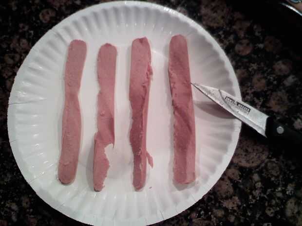 Para Cecina: Cortar el perro caliente en 4 rodajas (intente hacerlos algo delgada)