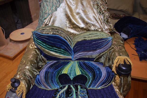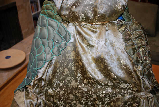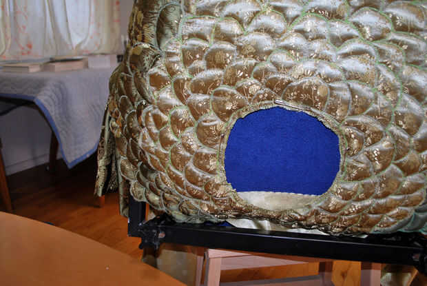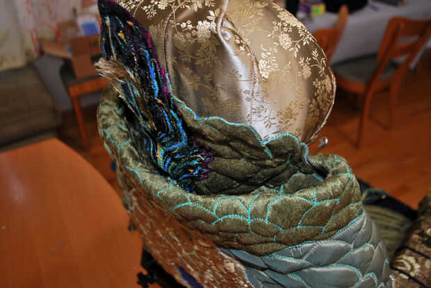 Saqué las escalas acolchadas, centrada en el agujero justo por encima del riel de respaldo de la silla e inmovilizados sin problemas. Luego me trasladé hasta la cabeza descansa, centrado en la pluma decorativa en la parte superior y clavado hacia abajo. Las escalas eran más largas que la parte posterior de la silla, así que había plegado en la base del soporte de cabeza y había fijado en lugar. Esto le dio a las escalas de una forma redondeada, escultural agradable. Tomé los bordes de las escamas y envuelto alrededor de a la parte delantera del asiento. Los cubrió a la pañería para no forman las escalas de ajuste a la silla, pero mantiene esa curva redondeada.