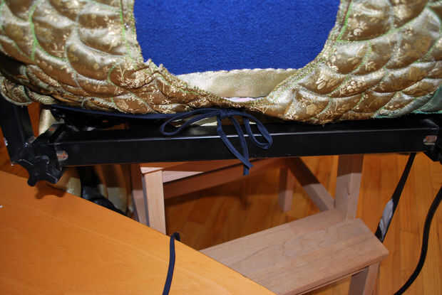 Después de coser el agujero, sacó el atar en el cojín del asiento del pavo real y había atado alrededor de la parte posterior del scooter. Yo atado en un arco, ya que pensé que podría tener que apretar más tarde. Levantó el borde inferior de las escalas y metido el arco debajo.