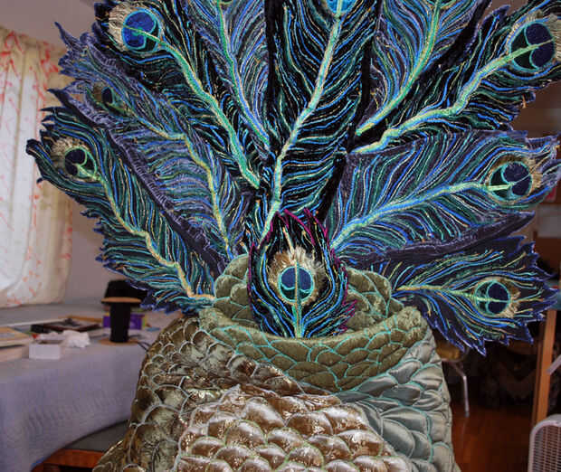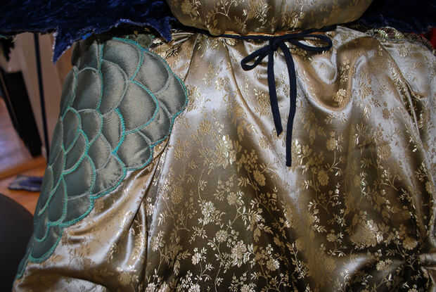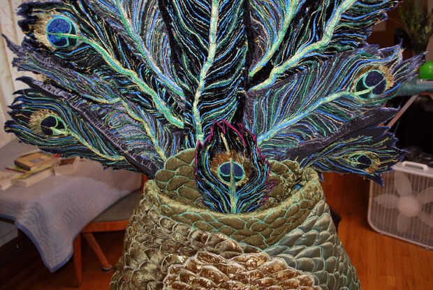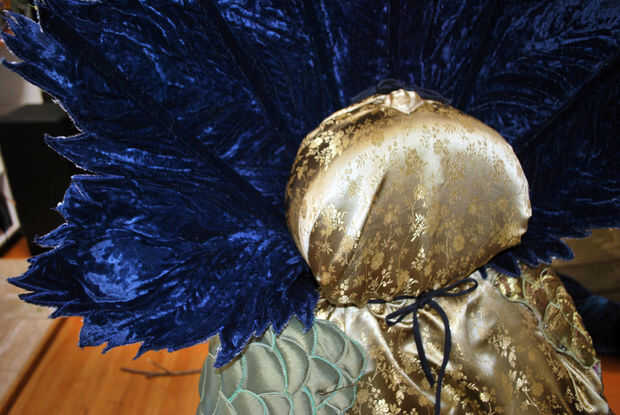 Colocar el ventilador ha añadido un pequeño bulto en la espalda, así que había ajustado los pliegues fijados en la base de apoyo para la cabeza. Dio el ventilador más espacio. Cuando se mueve uno de los pines, generalmente significa mover el resto de ellos también. Yo ajustar mi fijación en los lados de la balanza, comprueba cómo miraba en frente y luego rosca aguja de modista con 2 hebras de silamide gris. Las escalas fueron ligeras y no tirar a la tela firmemente, así que no necesito puntos resistentes. Además, estas costuras pueden aparecer realmente! Me slipstitched que los bordes de la escala abajo tan cuidadosamente como sea posible a la pañería, sacando las clavijas cuando fui. Después de coser a los lados, cosí los bordes de las escamas en los pliegues en la parte superior.