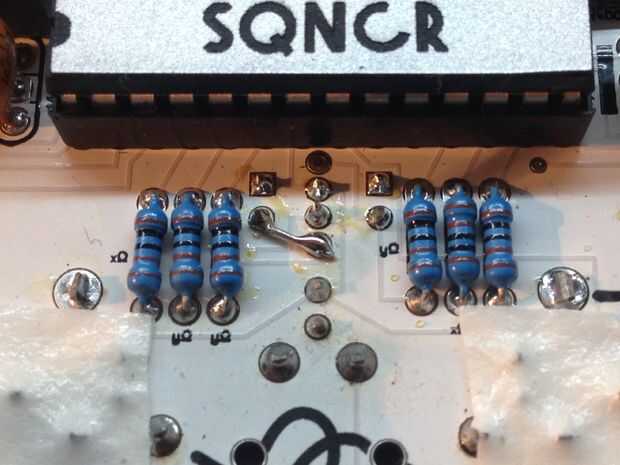 En SQNCR hay 3 pequeños LEDs en lugar de un LED RGB. El centro se va a los mediados 2 agujeros del RGB LED y los otros 2 van a sus ranuras con la misma polaridad + en la parte superior.