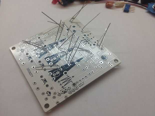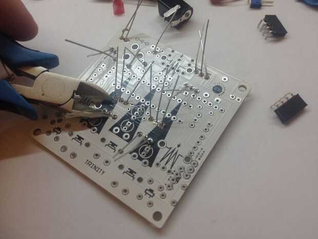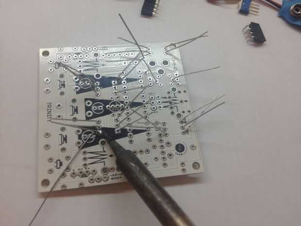 Doblar ligeramente las patas de los componentes, voltee la placa y soldar cada conexión correctamente. Cortar luego las piernas.