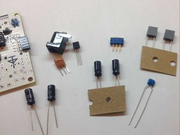 Todos los componentes ahora van en el tablero. Poner los componentes y doblar ligeramente las piernas. Tenga cuidado de la polaridad y el valor de los condensadores electrolíticos, de los grandes. Resonador de 16Mhz no tiene ninguna polaridad. Regulador de voltaje 7805 tiene la polaridad indicada. Conector de alimentación llenan los agujeros de la lata y no hacer ningún espacio entre el conector y el PCB.
