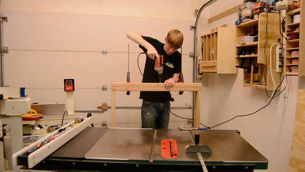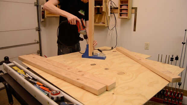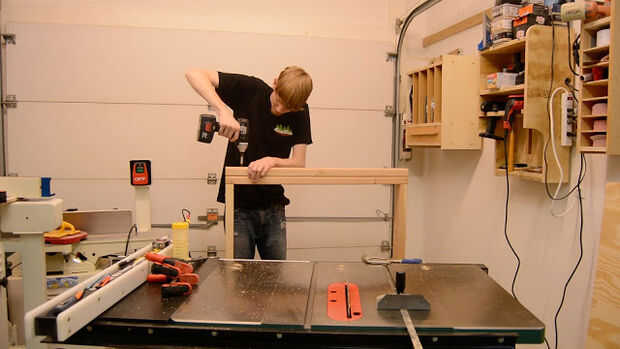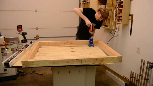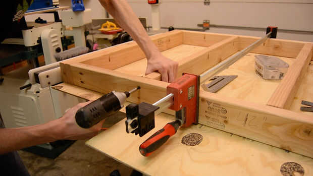 Después de cortar todo el empalme a la longitud utilizando una combinación de mis ingletes Sierra y corte de patín en la tabla VI. Primero empecé montando un superior y marco de poder en que usar tornillos de bolsillo a unirse a ellos juntos. También es una buena idea para perforar agujeros de ocultación en los lados para sujetar la parte superior más tarde, corté algunas calas de la capa de desecho para sujetar el estante inferior que sería ser incluido el cuadro inferior. Añadí centro ayudas y adelantó un doblado por los dos lados antes de colocar las piernas.
