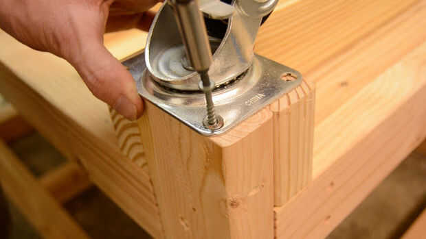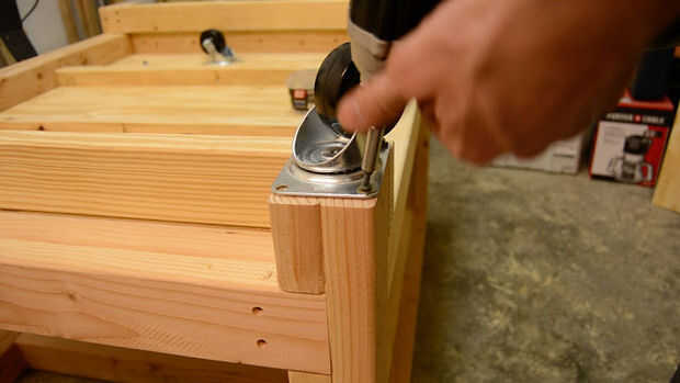 Antes de colocar la rueda tenía que cortar otra pieza para colocar en el interior de las piernas a ambos lados. las ruedas fueron demasiadas para las piernas y la pieza de adición en los interiores me da suficiente espacio para pegarlas. Esto también ayudará a fortalecer la mesa. He añadido las arandelas a los tornillos antes de conducir.