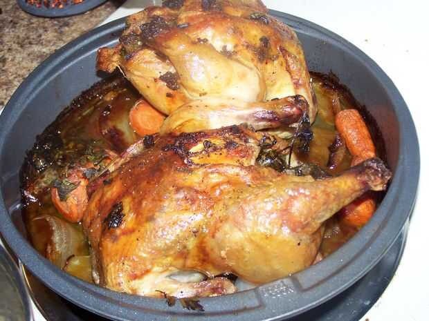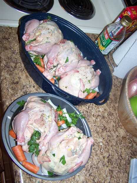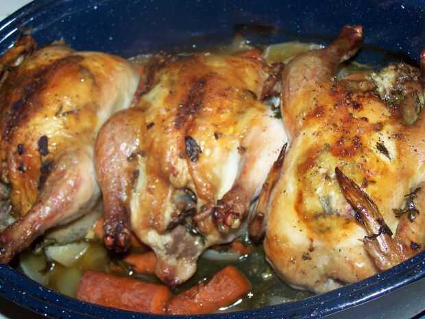 Restante la cebolla en cuartos y las zanahorias en el centro de la asación pan y coloque el pollo sobre ellas. Asar durante 20 minutos, luego reduzca la temperatura del horno a 400 º y asar durante una hora (de Cornualles gallinas solo asado a 375° por 1 1/2 horas a 1 3/4 horas). Continuar asando hasta que un termómetro de lectura instantánea insertado en la parte más gruesa del muslo (sin tocar el hueso) lee 165°.
